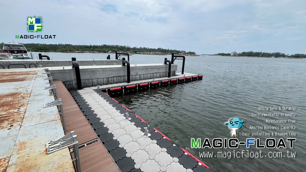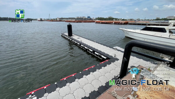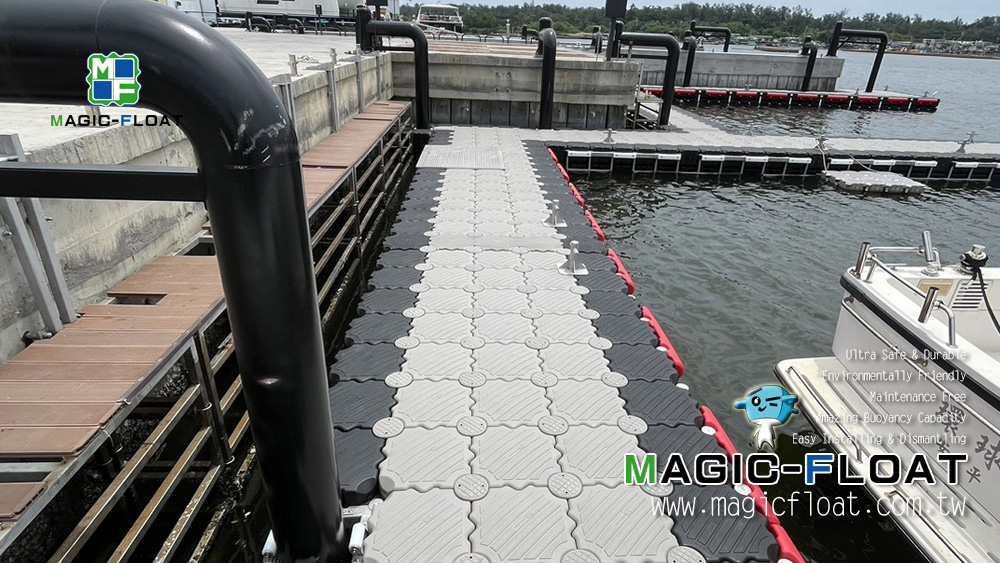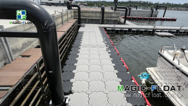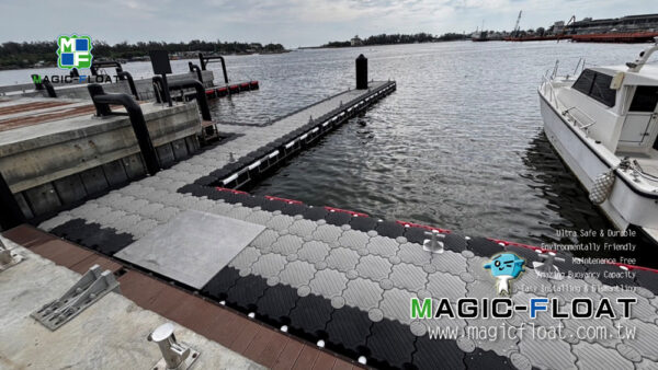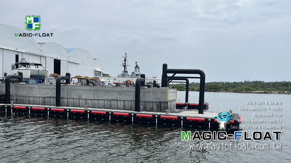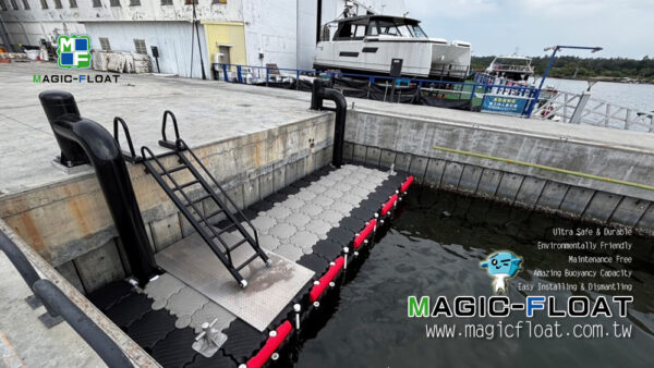以第二代工程浮筒灰色、黑色等顏色搭配, 組裝成雙層浮台, 配置紅色2L防碰條, 單柱型不鏽鋼繫船柱, 並以505滾輪組與固定樁(倒J型)搭配錨定固定此座雙層碼頭, 讓造船廠進行棧橋工作時安全使用. 台灣臺南市安平區安平港, 20250901