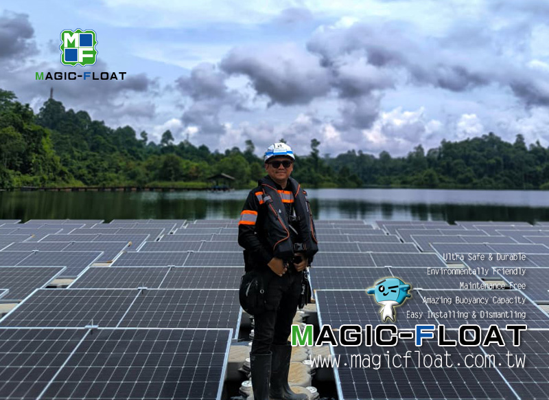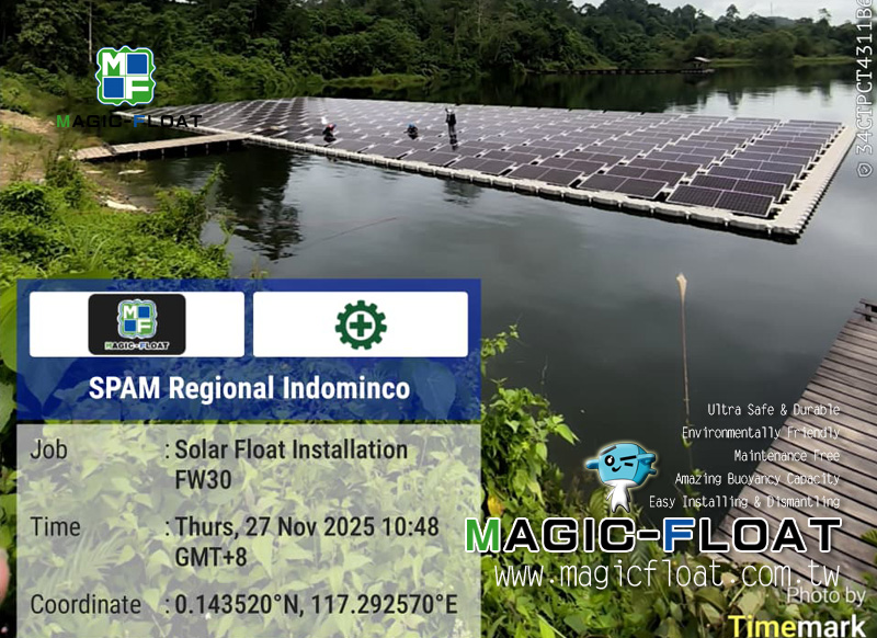 以太陽能板主浮筒搭配橫向走道浮筒及直向走道浮筒組裝成可讓太陽能光電板放置的水上浮台, 走道浮筒可讓維護人員於水面上安全行走於光電板之間, 進行後續發電維護作業. 地點位於印尼 20251127